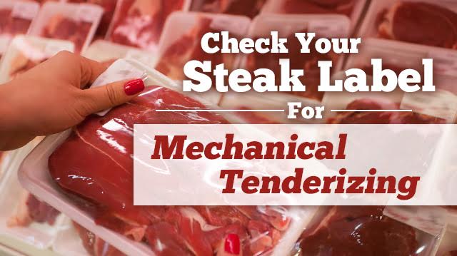 Consumers demand tender beef, which led meat processors to mechanical tenderization. Mechanically tenderized meat has been run through machines and punctured with needles or blades to make it easier to chew. The metal breaks down the muscle fibers. It doesn’t look different from conventional beef — it’s not like the surface is full of holes or tears.