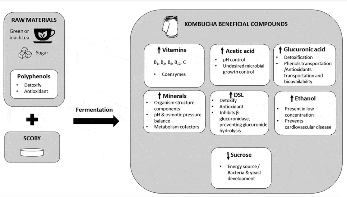 The chemical components of kombucha and their beneficial effects are summarized in this image from Journal of Food below: