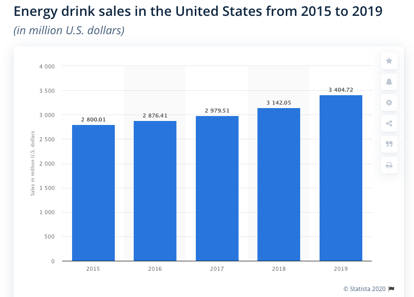 A four-year study conducted by the U.S. Substance Abuse Mental Health Services Administration has found a ten-fold increase in hospital-related emergency room visits caused by energy drink consumption. In 2015, energy drink sales in American amounted to 2.8 billion dollars and reached 3.4 billion by 2019.Â
